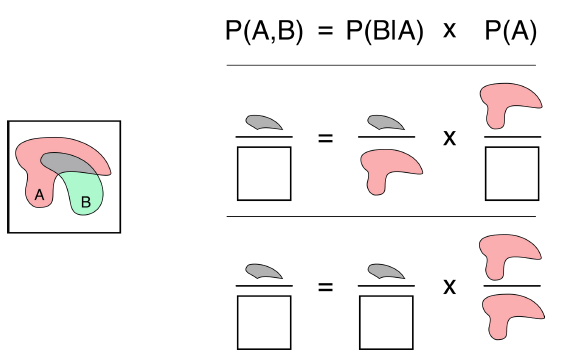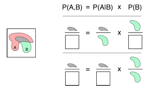 위의 그림을 보면, A와 B의 joint probability를 P(A|B)와 P(B)의 곱으로 표현할 수 있음을 확인할 수 있다. 이를 수식으로 정리하면, 아래와 같다.