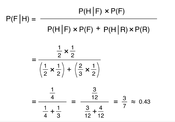 우리가 구하려고 하는 것은 P(F|H), 즉 Head일 때 fair coin일 확률이다. 이를 구하기 위해서는 3가지의 정보가 필요하다.