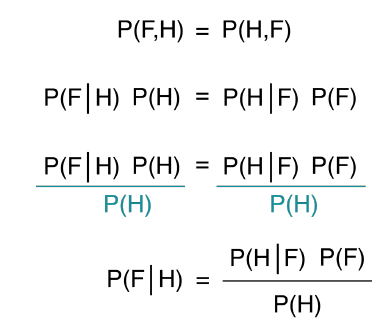 첫번째 줄에서, P(F, H)와 P(H, F)은 joint probability이기 때문에 같다. 이를 두번째 줄에서, 다른 형태로 변형한다.