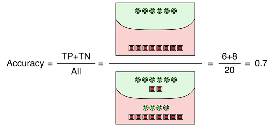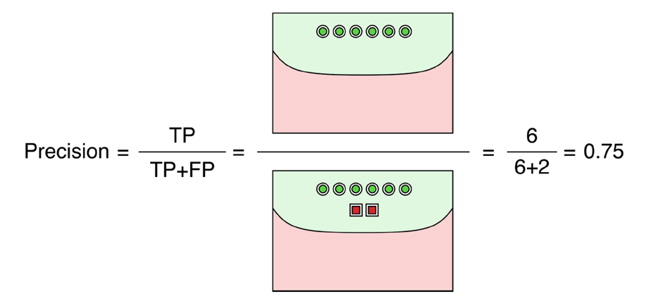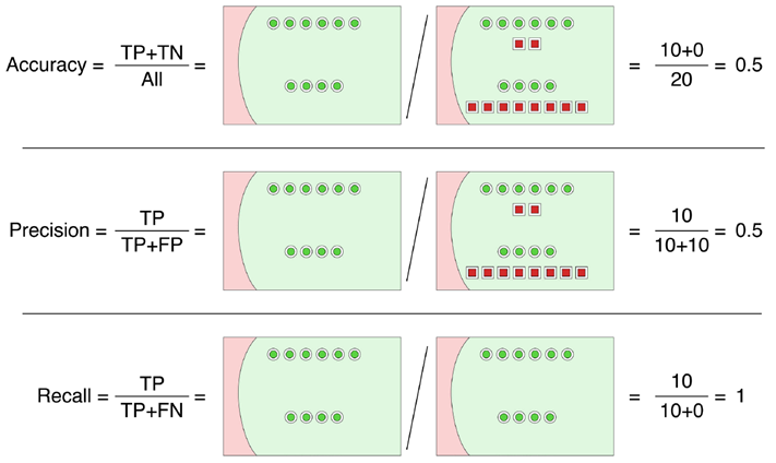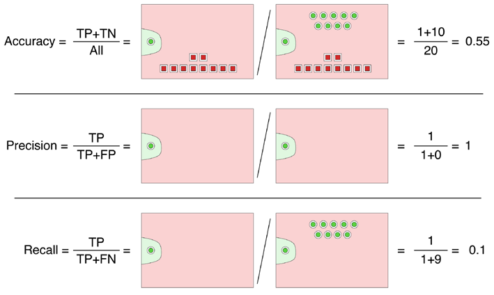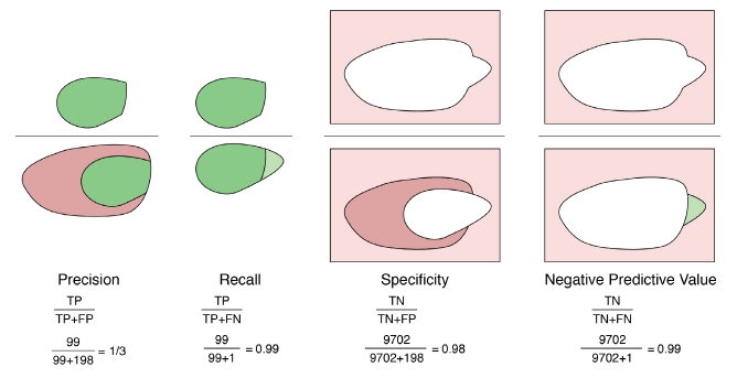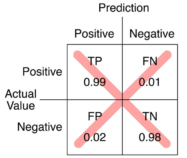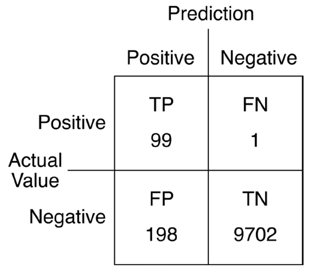 위의 figure는 총 1000개의 test planet에 대한 probe의 performance를 나타낸다. 이 중 101개의 planet은 생명체가 존재한다. probe는 1000 중에 100번의 경우 생명체를 찾았다고 제대로 report하였다. (true-positive. 101개 중 100개 correct)