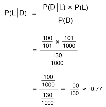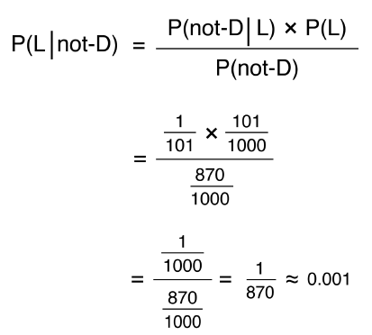 P(D|L)은, 생명체가 있을 때 probe가 제대로 detect할 확률이므로, TP/(TP+FN) = 100/101이다.