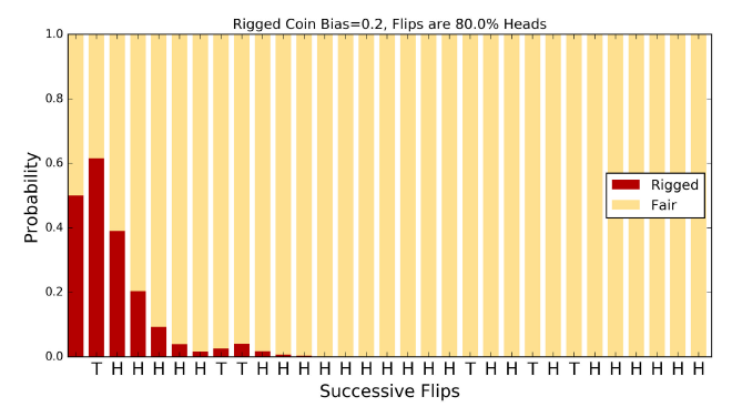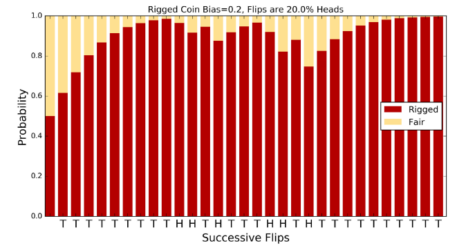 위의 경우는, bias가 0.2인 rigged coin과 fair coin 중 한 개를 골라서 30번 던진 결과이다. 우리의 가정에서, fair coin의 경우 15개의 head가 나올 것으로 예측되고, rigged coin의 경우 6개의 head가 나올 것으로 예측된다. 위의 결과는 총 24개의 head가 나왔으므로 Rigged coin이라고 예측하게 된다.