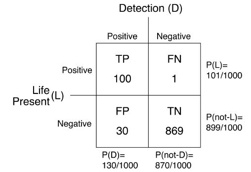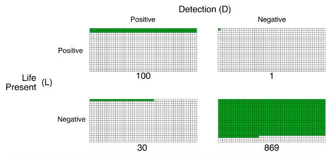 "life is present" 조건을 L이라 표현하고, "detected life"조건을 D라고 표현한다. L이 positive라면 planet에 life가 있는 것이고, negative라면 없는 것이다. 마찬가지로, D가 positive라면 probe가 life를 detect했다는 것이고, negative라면 probe가 생명체를 탐지하지 못했다는 것이다.