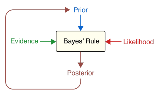 매번 observation을 새로 input으로 받아올 때마다, 우리는 이를 그 observation의 likelihood나 evidence, prior값과 결합하고, 새로운 posterior값을 계산한다. 이 posterior값은 다음 observation의 prior값으로 사용된다.