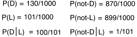 P(D)의 경우 "detected life"의 확률이므로 130/1000, P(L)의 경우 "life is present"의 확률이므로 101/1000이다.