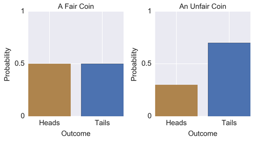 우리는 여기서 coin을 한 개 고르고, 그 coin이 fair coin인지 아닌지를 알고 싶다. Bayes' Rule의 형태로 30번의 동전을 던질 것이고, 각각 head인지 tail인지를 기록한다. 동전을 30번만 던졌기 때문에, 결과가 이상하게 나올 수도 있다.