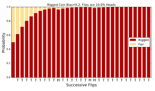 예를 들면, fair coin인데 6개의 head와 24개의 tail이 나올 수도 있다. 또한, rigged coin인데 똑같은 수의 head와 tail이 나올 수도 있다. 이러한 경우, 베이즈 정리가 observation을 어떻게 처리할까?